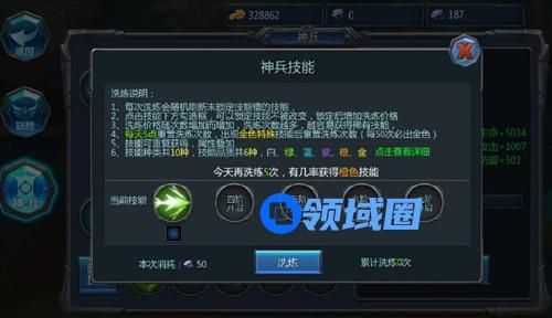 神兵达到3,4,5,6,7阶时,将分别开放一个技能槽,开放技能槽后可以通过洗炼获得强力技能,技能种类共10种,技能品质攻6种:白、绿、蓝、紫、橙、金。洗炼次数每天凌晨5点重置,重置后每天第一次洗炼免费。洗炼时可以锁定特定技能槽,需要花费一定数量钻石。