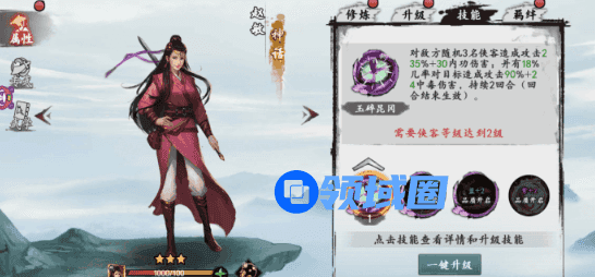 定位全体增伤,越战越勇。一个偏向辅助型的角色。大招随机伤害,并且有几率造成中毒伤害,并无什么特色可言。但是赵敏的其他技能效果都异常强力。绿色技能攻击有几率降低敌方15%左右的攻击。配合上蓝色技能开场削弱敌方全体百分比伤害。能够极大的提供己方的生存能力。紫色技能技攻触发后能回复一半的怒气,提升了自己的单人作战能力。团队作战能力不俗,单人也还不错。