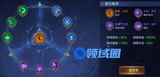 蓝绿星石主要是物理攻击、物理穿透、物理吸血和移动速度四种。紫色星石推荐天鹰,青藤,水灵,提升打野的续航,以及战斗时的生存和爆发力,橙色星石选择猎隼,进一步加强斩杀能力。