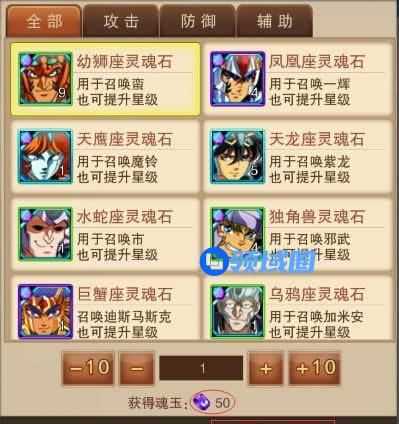 点击灵魂石进行炼化时可以看到炼化此灵魂石可得到多少量的魂玉。灵魂石分为攻击、防御和辅助三大类。注意:灵魂石可以用于圣斗士升星!