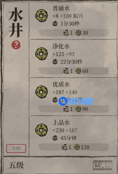 井这个建筑是百景图里性价比最高的建筑,耗费的材料少,施工时间短,但得到的收益大,尤其是将它放置在雕像旁边时,一级收益就能够拿一百多铜币。游戏日报吸吸果冻建议大家将井升到五级,这样建筑时间会缩短一半,一分半的时间你就可以获得一百枚左右的铜币,可比其他的商业建筑好多了。