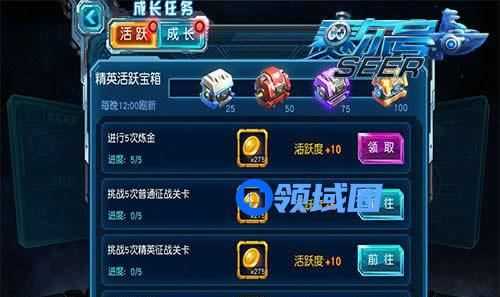 当然想要刷活跃值,也是需要技巧滴。每天快速完成“5次普通关卡”、“5次精英关卡”等任务选项,就可以轻松领取25至50的活跃度宝箱。在如此短时间就能获得丰厚的钻石金币奖励,想想都有点小激动呢。