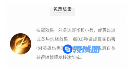 技能效果:对身边野怪和小兵,或英雄造成炙热灼烧效果,每0.5秒造成真实伤害(对英雄伤害衰减)持续2秒。惩击后自身获得短暂爆发移速加成。