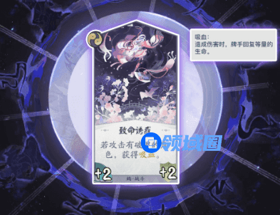 卡牌作用:这张形态牌不仅可以增加力量和护驾,当对面有破甲的角色(包括牌手)的时候还可以获得吸血,用这张牌的时候一般都触发了2点破甲,这时可以恢复4点以上的生命,非常赚节奏。