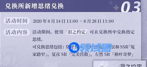 活动期间,兑换所新增莫弈SSR咫尺远近、陆景和SSR冤家路窄、夏彦SR完美营救、左然SR秋叶寄梦。