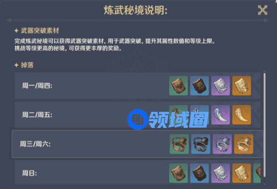 突破素材为一周轮换制,旅行者可以根据自己缺乏的素材选择时间去刷秘境。