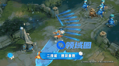 二技能发射出爆裂的重炮,首先是一个金色的透明的剑鱼,遇到墙壁或者敌人后爆裂开来,如同流星一般散落开来,发出蓝色的光芒。蒙�身上还有各种星星圈圈在冒泡。