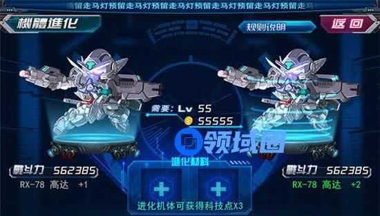 每一台SD高达的机体都有不同的成长偏向,成长偏向不同,影响属性的增长。机体可以通过升级、改造、进化等功能进行战斗力提升。机体拆分通过机体拆分,可以获得功勋、进化芯片、机体核心和神秘合金。