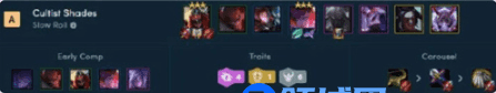 这个阵容的转型方向比较多,7人口四忍三夜影理论上是可以成型的,如果拉升到8人口可以单挂一张凯隐,这样可以凑出四夜影、天煞的羁绊就非常完美了,如果早期阵容成型方向不好,可以将阿卡丽、凯南、慎替换成滑板鞋、剑魔、烬直接凑六腥红夜影的打法方向。