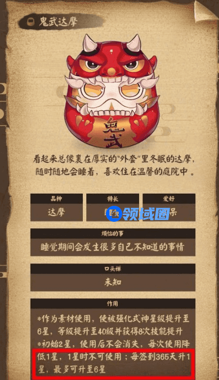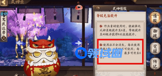 使用鬼武达摩来强化式神可以使得式神直接提升至6星、等级提升至40级并获得8次技能升级,效果可以说是十分强劲的。
