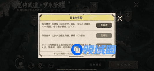 如果你不想浪费时间,每天去打两局游戏的话,你可以选择在11月1日再参与,因为在那一整天,只要跟有李小龙皮肤的玩家同阵容游戏,就可以获得35000点经验。直接连续升级,一天就能直接通关到第4关,无须每天守着领取2小时刷新的实时经验包。