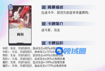 攻击系敢叫板能量系的底气所在!叠伤的机制赋予了可怕的上限,配合过牌和重现能够实现一卡伤害爆炸!初始伤害倍率低,随着不断的打出伤害越来越高,是背摔流的核心卡,也是所有战斗系卡牌中最值得投资的卡牌。综合评级5星(满5星)。