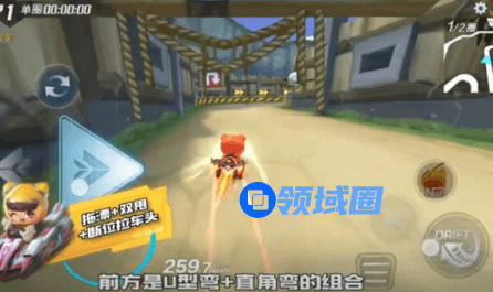前方是U型弯道,车友们可以使用长拖漂+双甩操作,快速过弯。