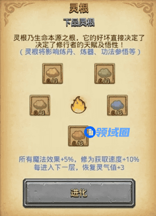 灵根分为 下品 - 中品 - 上品 - 天品 - 仙品 5个等级,主要影响修为、丹药的获取量和藏经阁的功法领悟。