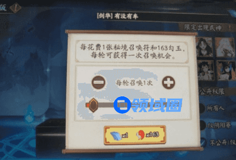 每场秘境召唤分4轮,每轮出现12张符咒,每花费1张秘境召唤符和163勾玉即可在每轮中获得1张符咒。每场秘境召唤将至少出现1名SP/SSR式神。