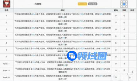 “岩崩锤”一共会发生两次质变。第一次发生在专一,降低了一点技力消耗。第二次发生在专三时,提高了1%的最大生命回复。
