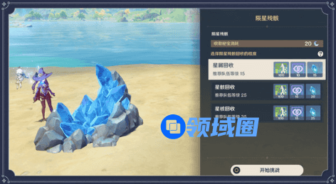 在倒计时时限内成功即可完成挑战,消耗20原粹树脂回收陨星残骸可获得「熄星能量」与角色好感经验。累计回收一定数量的陨星残骸可以在活动界面领取额外奖励。