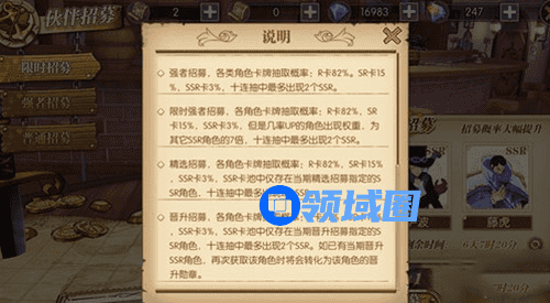 各角色卡牌抽取概率:R卡87%,SR卡10%,SSR卡3%, SSR卡池中仅存在当期晋升招募指定的SSR角色, 十连抽中最多出现2个SSR。如已有当期晋升SSR角色, 再次获取该角色时将会转化为该角色的晋升勋章。