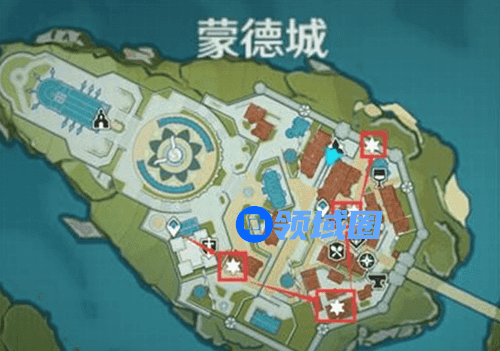 完成任务需要收集的四个具体位置见下图,炼金附近的点位实际位置是更加靠近炼金的位置,但继续靠近无法标点。推荐大家从西风骑士团顶部的传送点为起点依次收集,比较方便快捷。