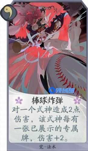 棒球炸弹作为觉得一勾玉法术牌,初始伤害只有2点,对面每有一张已展示目标式神的牌这个伤害增加2,通常情况下如果一个式神亮了两张牌左右,我们的一个棒球炸弹就可以在前中期解决掉他,是一个稳赚不亏的攻击法术牌,可能缺点就只有不能攻击敌方牌手,不过作为斩杀或者补刀这张牌已经十分强力了。