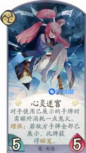 觉的三勾玉形态牌,也是觉得SSR卡牌,俗称自闭女孩。有着和灵视一样的身材,也是作用于以展示手牌,但是特效可以说十分强力,每一张被展示手牌都要额外消耗一点鬼火,如果对方是没有携带打火机制的卡组,那么他们使用被展示手牌后连攻击都无法进行。心灵迷宫多数用来配合觉醒觉,因心灵迷宫在敌方展示所有手牌后,可以获得瞬发。不过要注意敌人的瞬发还是第一次不消耗鬼火。