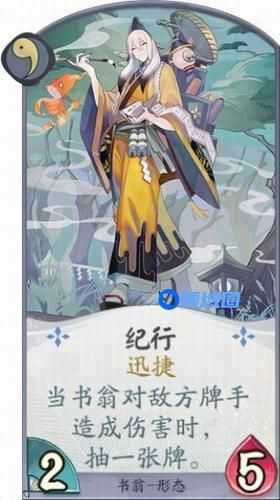 纪行作为书翁的1勾玉形态牌,身材可以说是尚可,2点力量值,5点生命值可以说很难被一下处理掉,而加上有一次免费攻击的迅捷效果,所以如果能够先手的话纪行的效果一定会触发,而如果不是先手,纪行也可以留在手中,配合觉醒书翁当一次免费进攻,毕竟觉醒书翁的效果就算书翁气绝了也会触发。