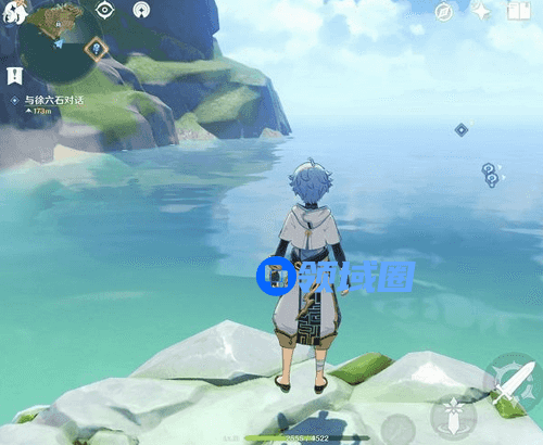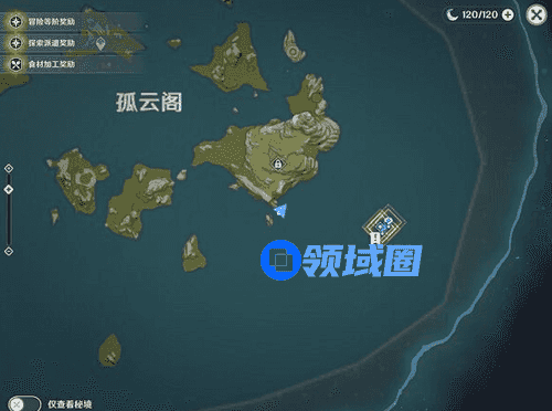 如上图所示,这个位置位于孤云阁右下边,这里有个石台阶,站上去面向大海左边有个箱子,调查之后获得500摩拉。