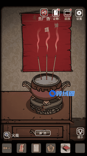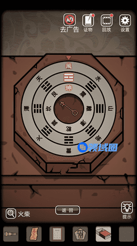 10.点击右边的香炉,插上三根香,用火柴点燃,得到线索风、坤(对齐这两个再试中间的)
