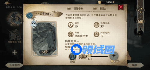 九段以上决斗基本人人都用。能加血、隐身,不过加血量实在太少,主要是隐身。在雾中的时候敌方的召唤物是打不了你的,游走球的自动弹射也打不到,除非对手自己估计你的方位定向发射伤害。注意被敌人定向打中后,你的位置就暴露了。搭配驻场卡:独角兽、脊背龙(进一步保证这两张卡在生效之前的安全)