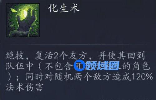 化生术:绝技,复活两个友方单位,使其回到队伍中