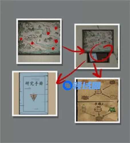 5、根据明信片线索,移动地图上面的6个点,打开地图机关,获得研究手册和一张卡片。