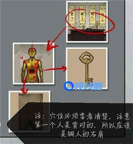 8、依次按照正确的穴位插入银针,打开铜人机关,获得中药室钥匙和羊皮纸。