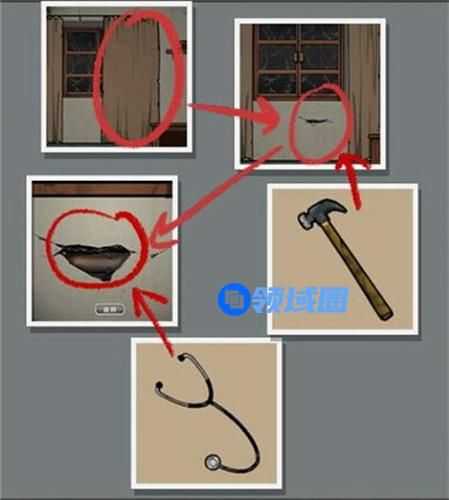 18、回到办公室,点击右窗帘,用榔头敲开墙壁的裂缝,在露出的水管上使用听诊器。