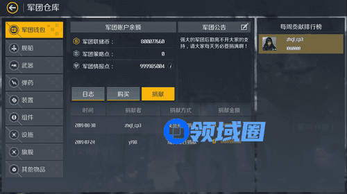 军团仓库与个人仓库非常的类似,就是存放军团所需的各种物资,包括常规舰船,设施和旗舰等。但不同于个人仓库的是会有异响“数字账户”,这个数字账户里面存储的就是军团使用的货币,货币的来源于军团成员的每日贡献,或者是通过军团贸易获取,这些货币可以用来购买物资等等。
