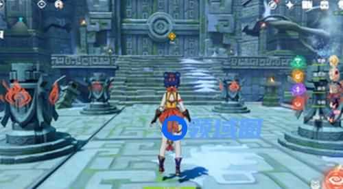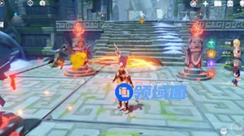 首先这个大门前面有四个火元素机关,想要打开大门,必须【用火元素同时攻击这四个机关】。目前所有的火元素角色中,只有香菱的大招才能实现,【在四个机关中间开启大招】会出现一个火环,瞬间点燃四个机关。