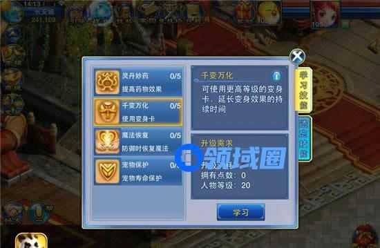 玩家在技能列表中学习了剧情技能“千变万化”之后,就可以使用变身卡。“千变万化”共有5级,等级越高便可以使用更高级的变身卡,并延长变身效果的持续时间。学习“千变万化”的剧情点需要通过精英历练获得。