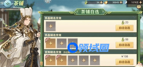 点击茶铺货架中的“加号”键,即可挑选货架中的“精选”与“普通”任选商品,消耗货架标记数量的茶晶或人民币直购后,即可获取选择的商品!超值特惠,不容错过噢!