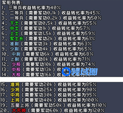 7. 进攻据点时,己方势力占有度达到80%及以上,即可占领该据点。以下为军衔列表: