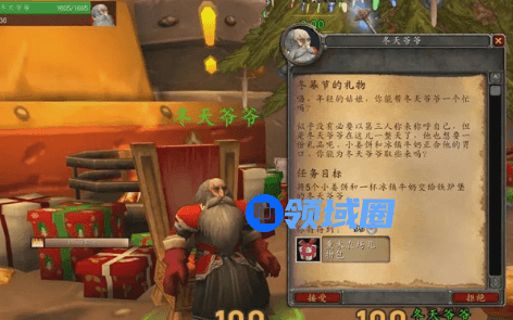 现从地精那里接一个任务去找冬天爷爷的,交完之后东西爷爷就会给你一个新任务“冬幕节的礼物”。需要五块小姜饼和1瓶牛奶,小姜饼需要自己做,冰镇牛奶找NPC就可以购买到。