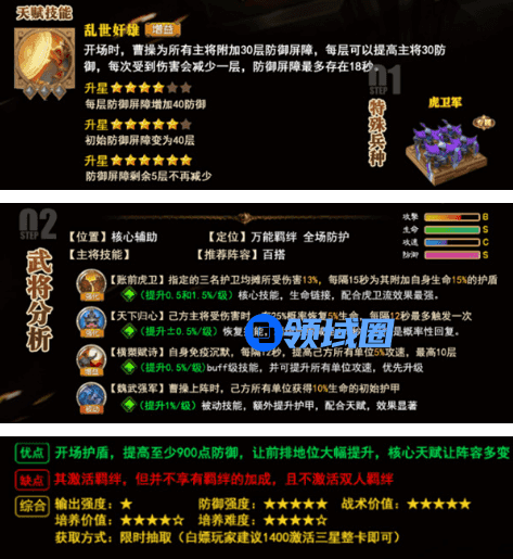 技能升级顺序:帐前虎卫>横槊赋诗>魏武强军>天下归心。