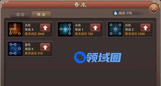 阵法系统在玩家通关至崆岘山(2)时即可开启阵法系统。玩家可在奇术中学习新的阵法以及升级阵法的等级。