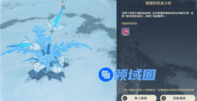 挑战时,旅行者们可以选择单人挑战或匹配挑战。汲取了奇迹的生命之力,「复生的急冻树」的力量受到强化,旅行者们需要先击败附近出现的魔物,再利用魔物掉落的「深赤之石」破坏「凛冬之棘」,粉碎急冻树的护罩。