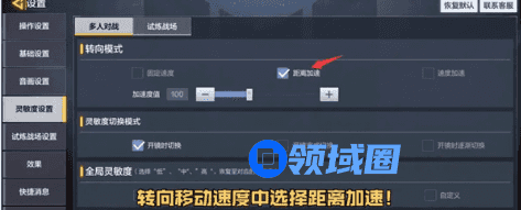 值得注意的是,转向移动速度一定要选择距离加速,滑动距离越长,准星移动越快!