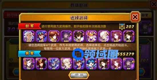 调整好阵容之后,选择一个对手,这时进入去掉对手预备武将的阶段,我们可以看到对手的9个预备武将,点击一个武将就可将其从实际战斗中去掉,去掉对手武将的同时,我方武将也会随机被去掉一个。听天由命吧,少年~