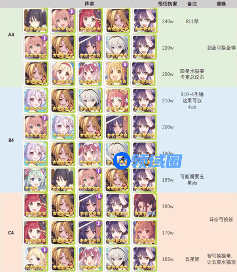 四王这里的阵容变化非常多,仅列出一部分。环奈双弓刀可能是A4的最优解之一,而且由于小马的毒,R11的tp弓也能舒服地五动一ub了。