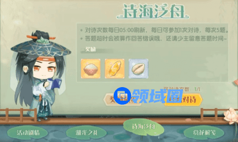活动说明:江南春光明媚,少主跟随西湖莼菜羹等一行文人们游湖踏青,吟诗作对。规定时间内答对的题数越多,获得的奖励越丰厚喔。
