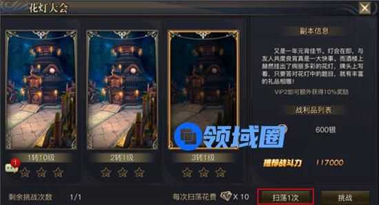 当副本的某1个难度达到3星时,就可使用钻石直接通过扫荡完成当日副本次数,扫荡后将直接获得该副本扫荡的难度的经验,灵羽或金钱奖励。