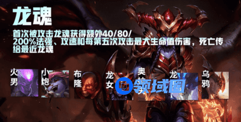 战斗开始时,生命值最高的龙魂英雄会获得龙之庇护,获得额外的属性以及每第5次普攻造成目标最大生命值的魔法伤害。