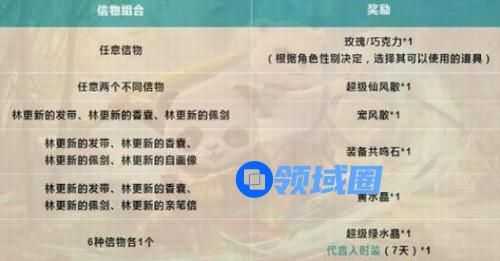 使用不同的1~6种信物组合,可兑换不同奖励。