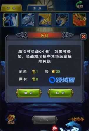可以向其他玩家夺宝,意味着自己身上的神兽法身碎片也不安全吗?没错,你也是别的玩家的抢夺对象。刚意识到这一点的时候小编吓得赶紧把所有碎片都合成了,结果包裹空间不够……其实完全没必要哦,挂起【免战牌】表示“请勿骚扰”即可强行免疫抢夺。一个免战牌效果两小时,时间长度可叠加。如果抢夺他人则免战buff失效。想保护稀有法身神兽碎片的玩家不要慌,免战金牌挂起来!